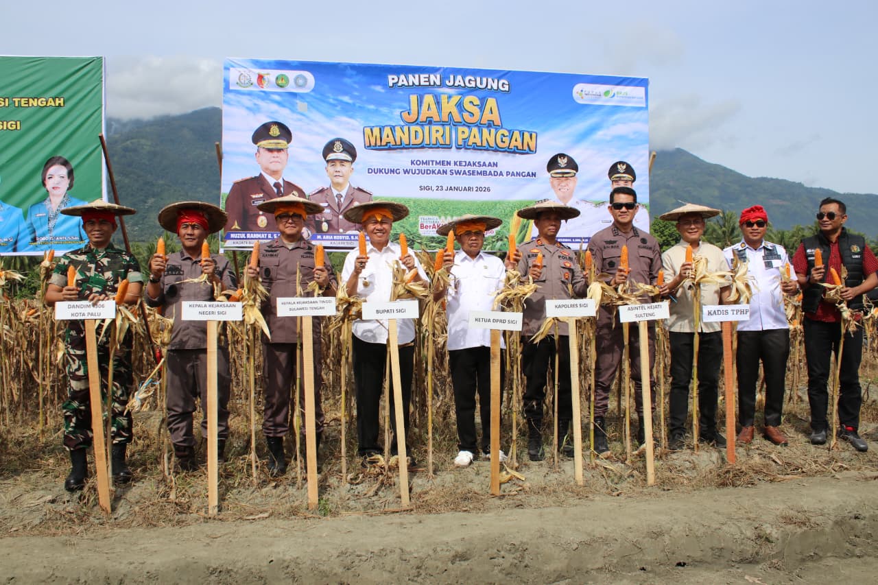 KLIKPARIGI.ID Kejaksaan Tinggi Sulawesi Tengah menggelar panen jagung Program Jaksa Mandiri Pangan bersama Pemerintah Kabupaten Sigi di Desa Rarampadende, Kecamatan Dolo Barat, Jumat (23/1/2026). Kegiatan ini menjadi bagian dari dukungan Kejaksaan terhadap penguatan ketahanan pangan dan pemberdayaan masyarakat desa.